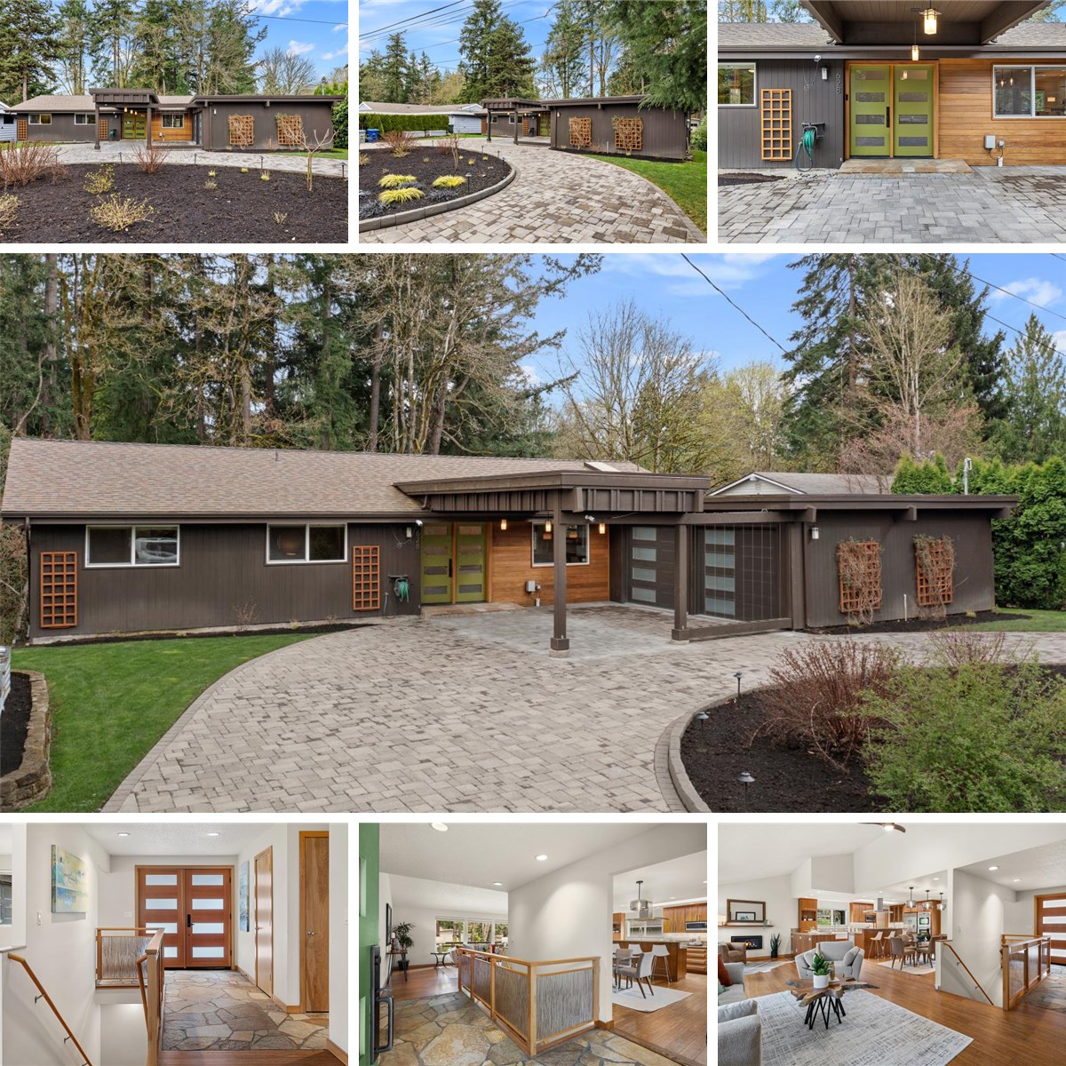 A perfectly remodeled mid-century modern in Wilburton's Brookwood neighborhood! Large lot with level front and backyard spaces, 2 full-length ironwood decks, and a serene creekside setting. Open great room layout on main level with vaulted ceilings, wall of windows overlooking the verdant backyard, and sliding door to deck. Designer kitchen with island, bar, double oven, gas cooking, DCS commercial appliances, slab counters, and more. Owner's suite features bathroom with curbless shower, vaulted ceiling, and sliding door to deck. 3 bedrooms, 2 bathrooms on main level. Lower level features large rec room, bathroom, fitness room/bedroom, 2 finished storage rooms, and indoor swim/spa pool. Stay fit right at home! Minutes to everything in Bellevue: downtown, BelRed, shopping, dining, parks, transit, and top-rated schools.